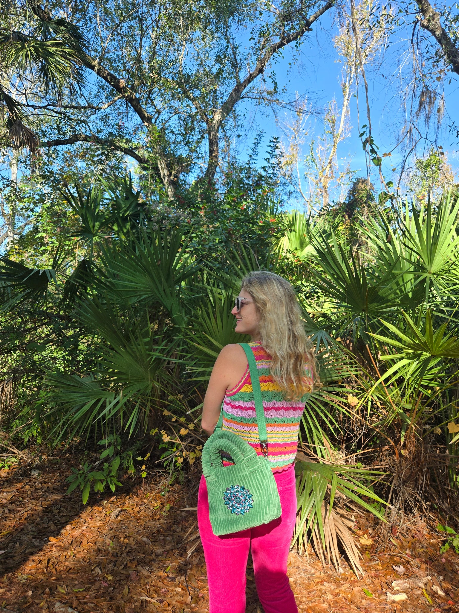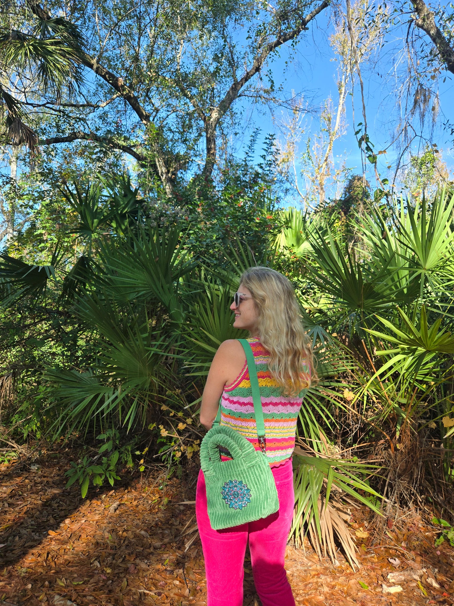 Green courdoroy handbag with handles and an adjustable strap adorned with a one of a kind Mandala Patch