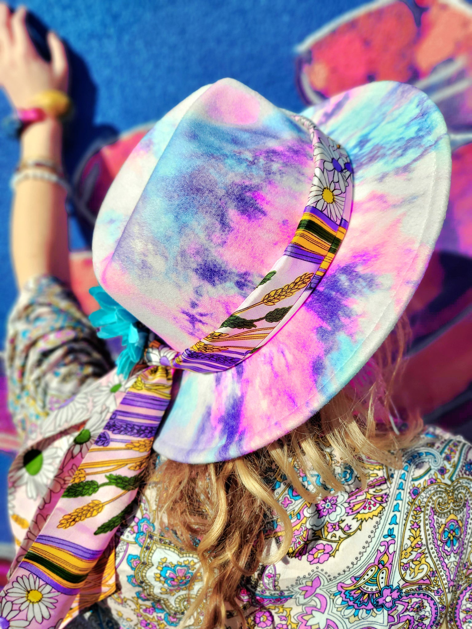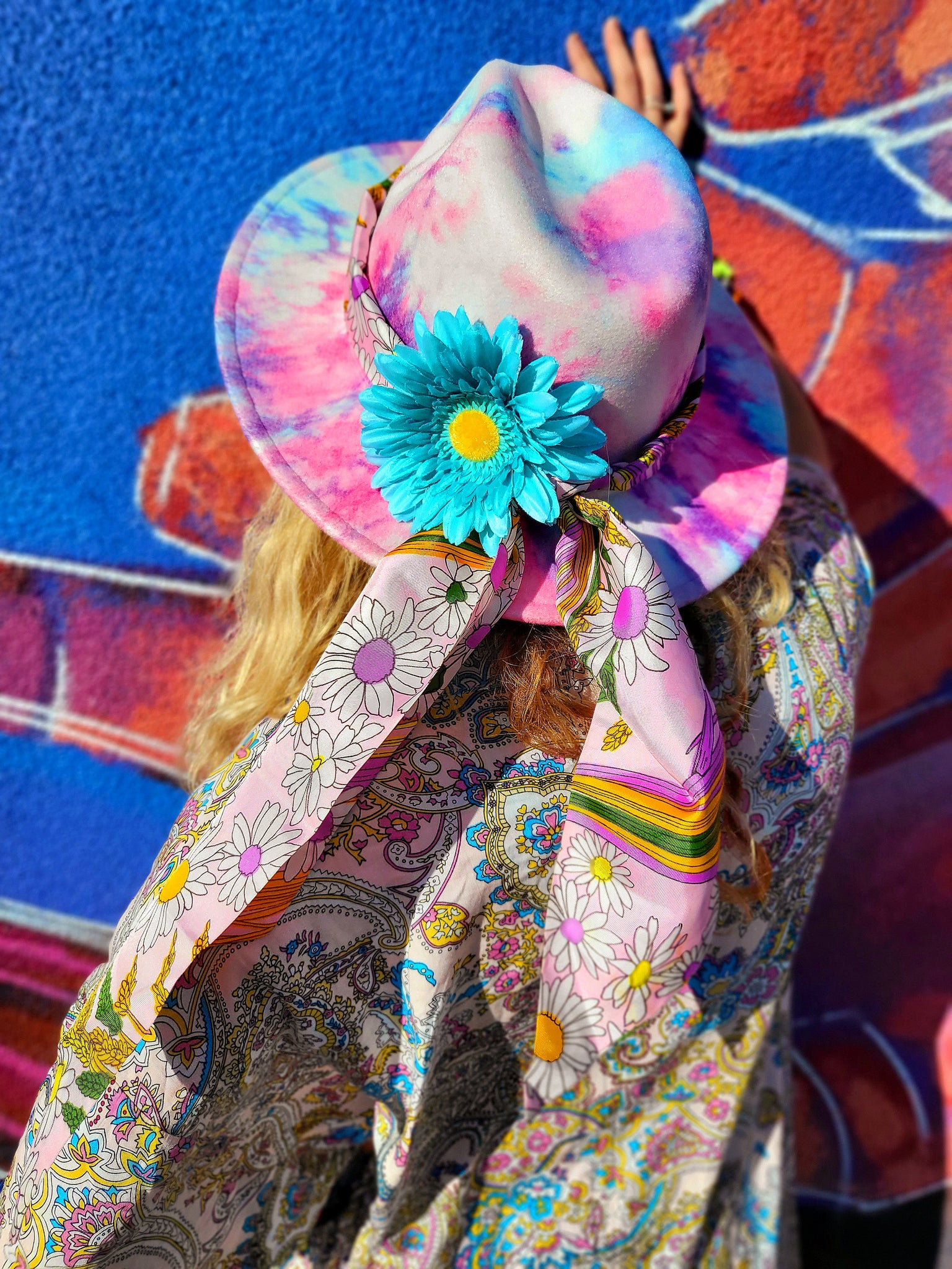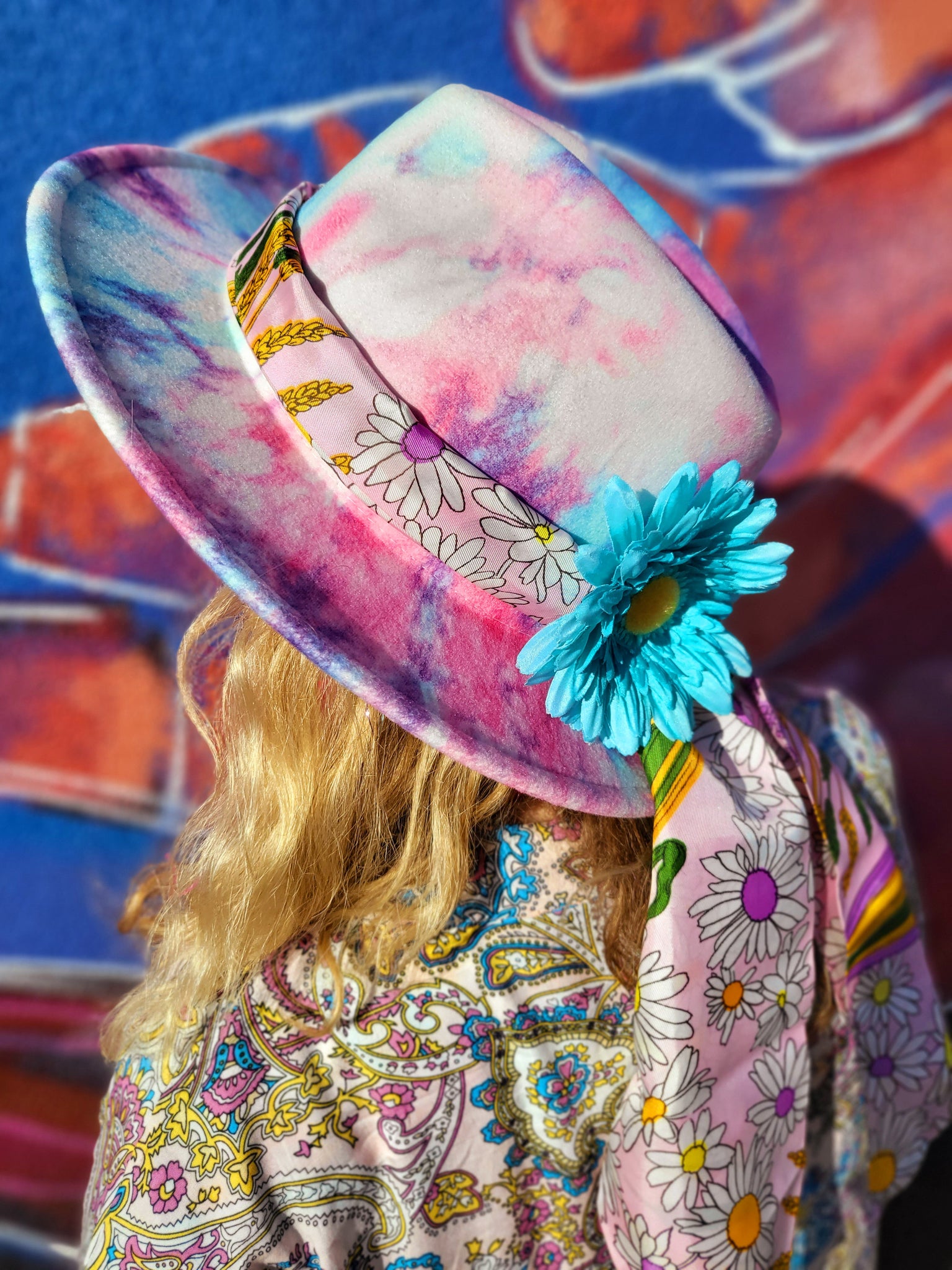 This Dreamy spring flingy disco daisy cotton candy Cowguurl hat will be your new fave accessory this spring ! She is adorned with a handpicked vintage silk scarf strap detachable electric blue daisy clip. All hats come with adjustable string to for heads of many sizes .