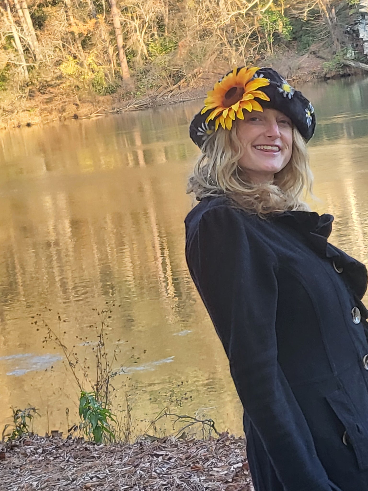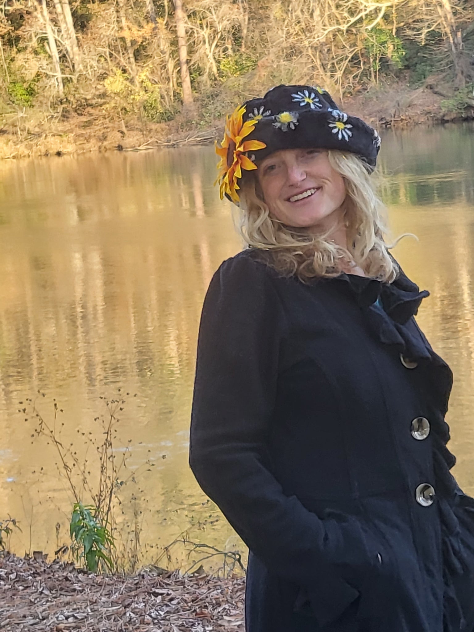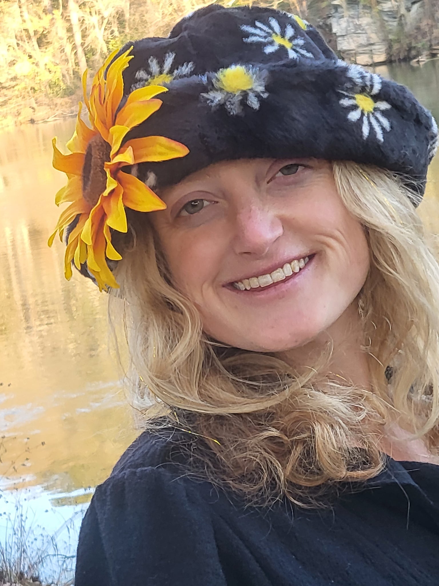 Fuzzy Daisy in the dark bucket hat sure to keep you warm on the coldest of daze. Adorned with a detachable Sunflower you can clip anywhere on your outfit !