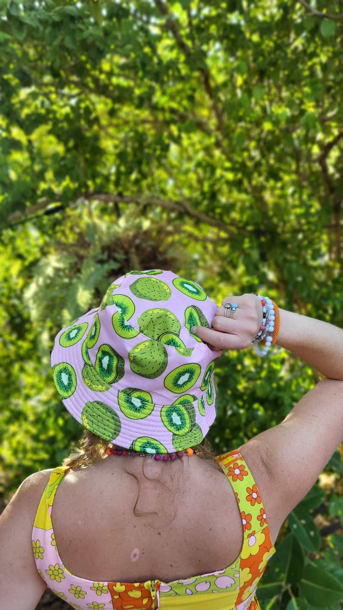 Adorable baby pink Kiwi bucket Hat. Pair with your fave spring outfit!