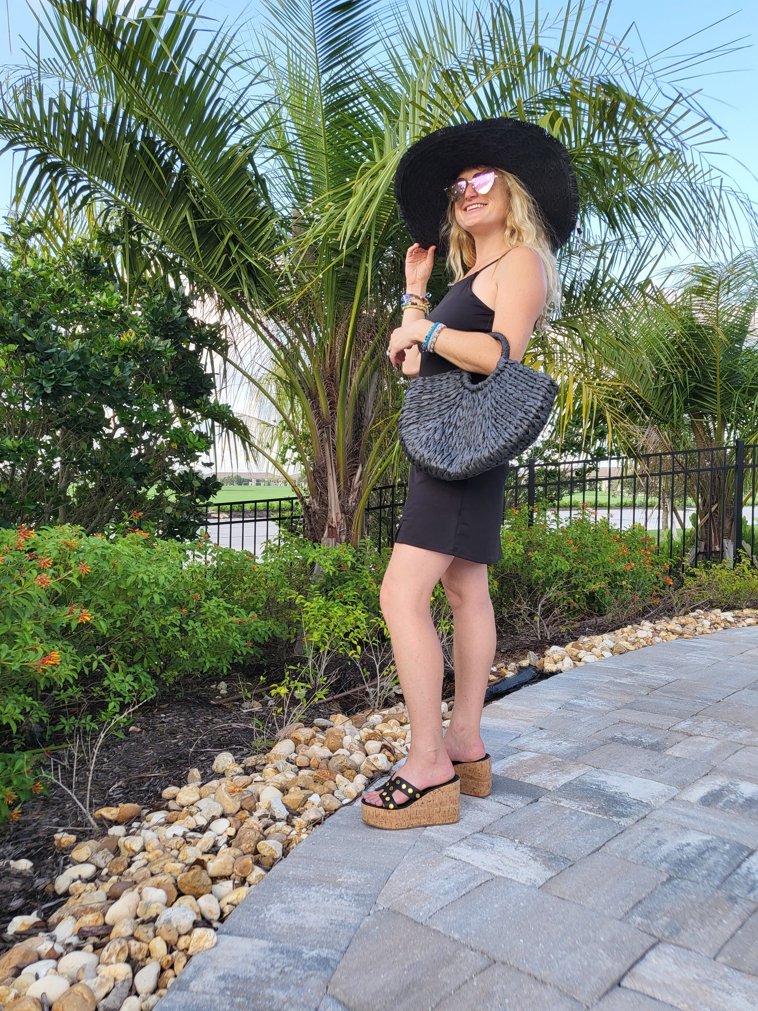 Elevate your style with this chic large black straw tote bag, designed in a trendy half-moon shape. Perfectly complementing your look, it features a striking black adds a touch of Sass and Class. Whether you're heading to the beach or a casual outing, this bag is both fashionable and functional, making it a must-have accessory for any wardrobe.