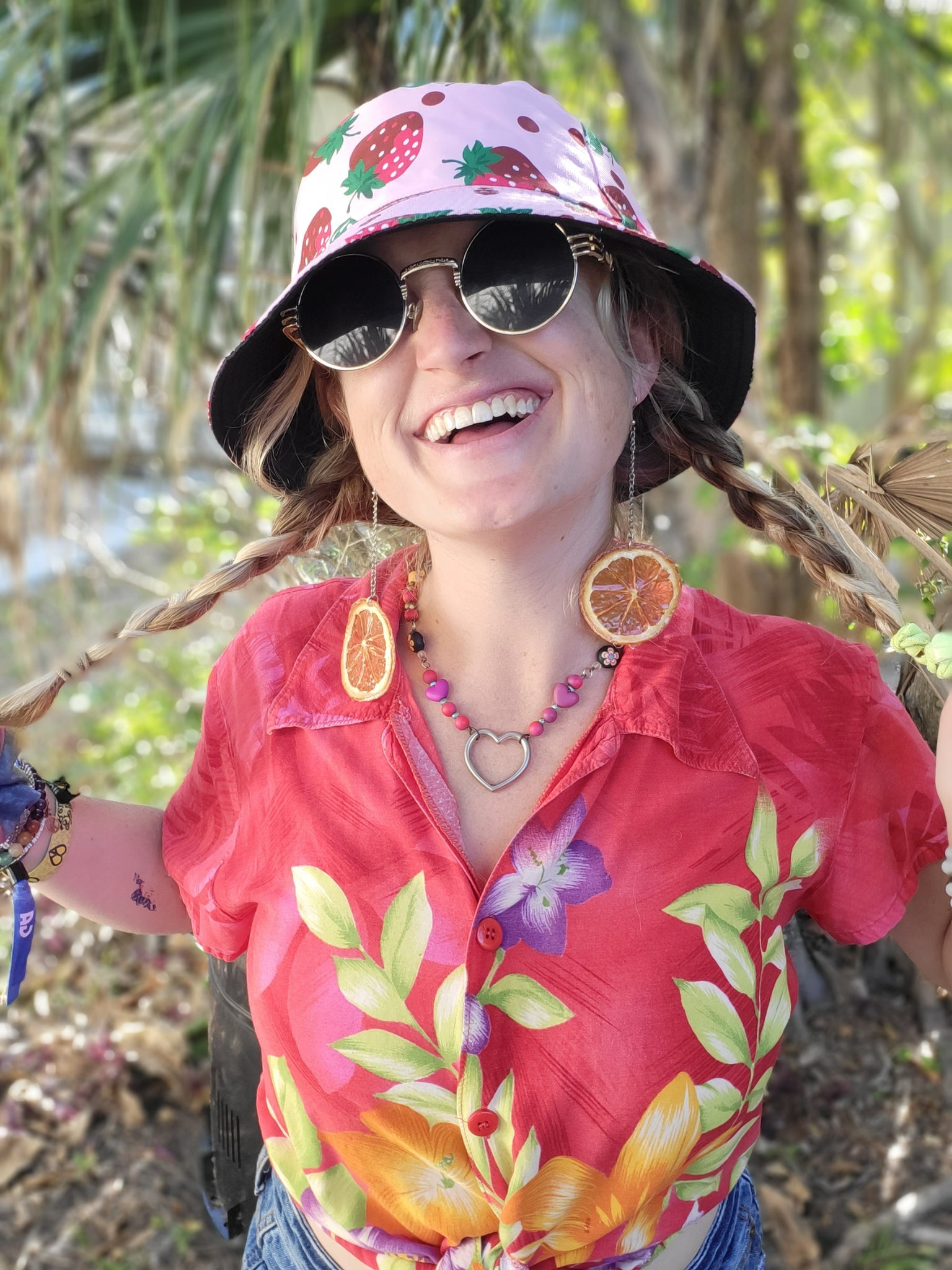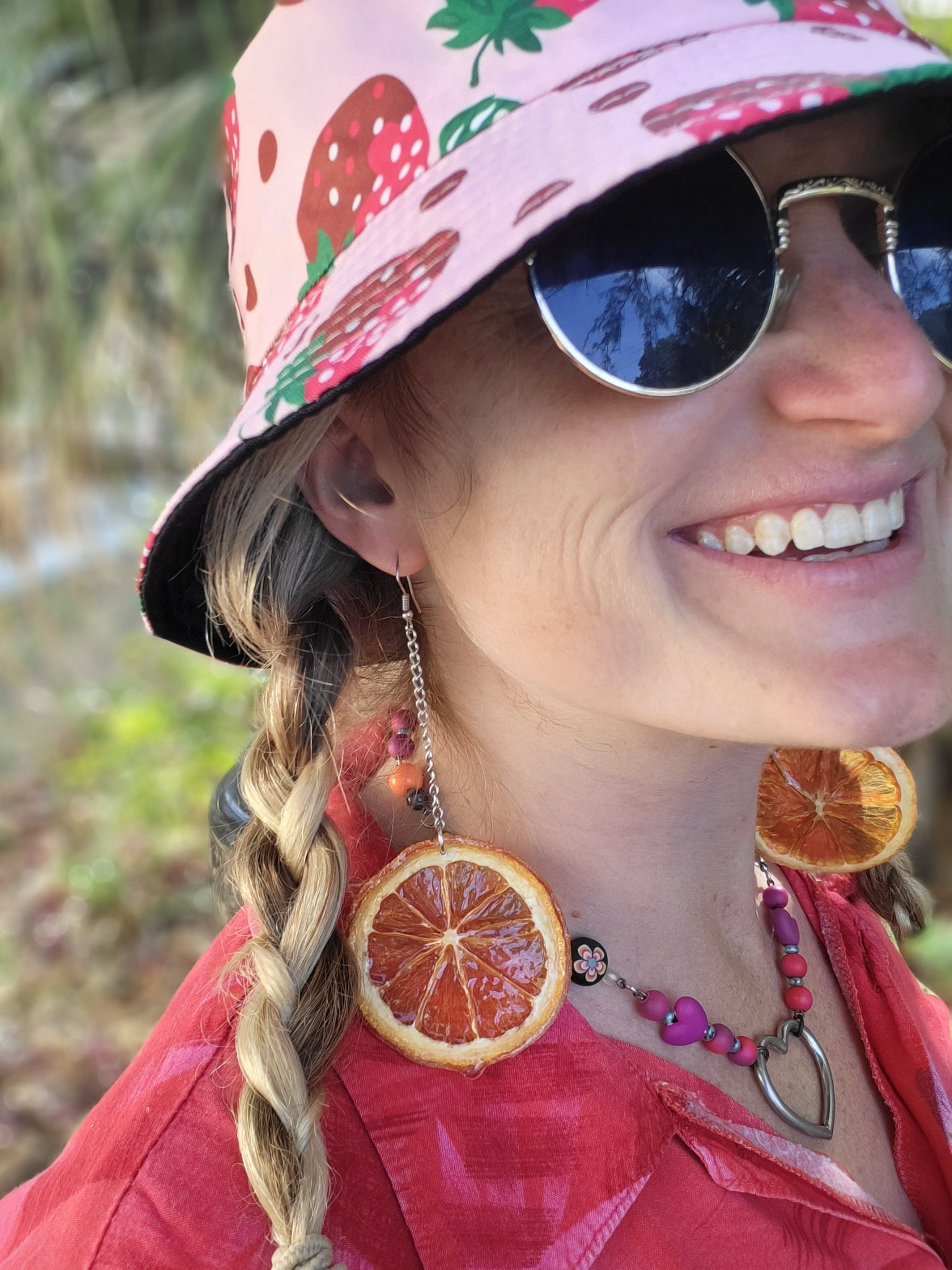 One of a kind Handmade long chain Dangler orange earrings. Designed and made by Andrea Greenleaf