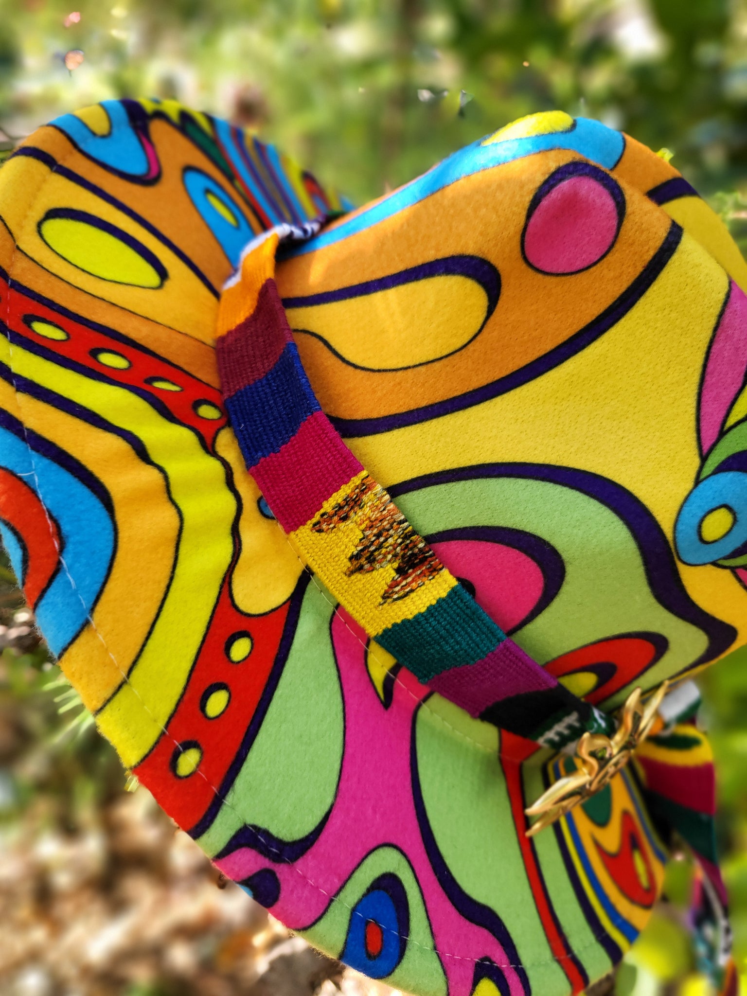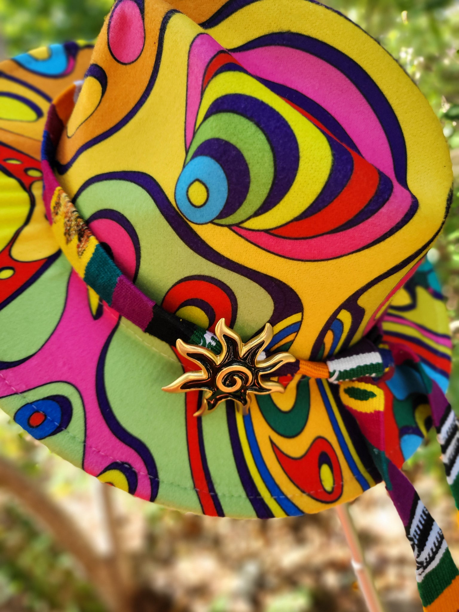 Funk up your fit with this fantastic and Fabulous Rainbow Galactic Psychedelic Fedora. This one of a kind Fedora is Adorned with a rainbow Authentic Guatemalan "Toto " Strap you can wear and style in a variety of ways. The Rainbow Strap is accompanied with a vintage one of a kind Black and Gold Sun Broach from the late 80s. PIr this Funkadelic Hat with any fit and you are ready to boogie ! Adjustable strap inside fits most heads
