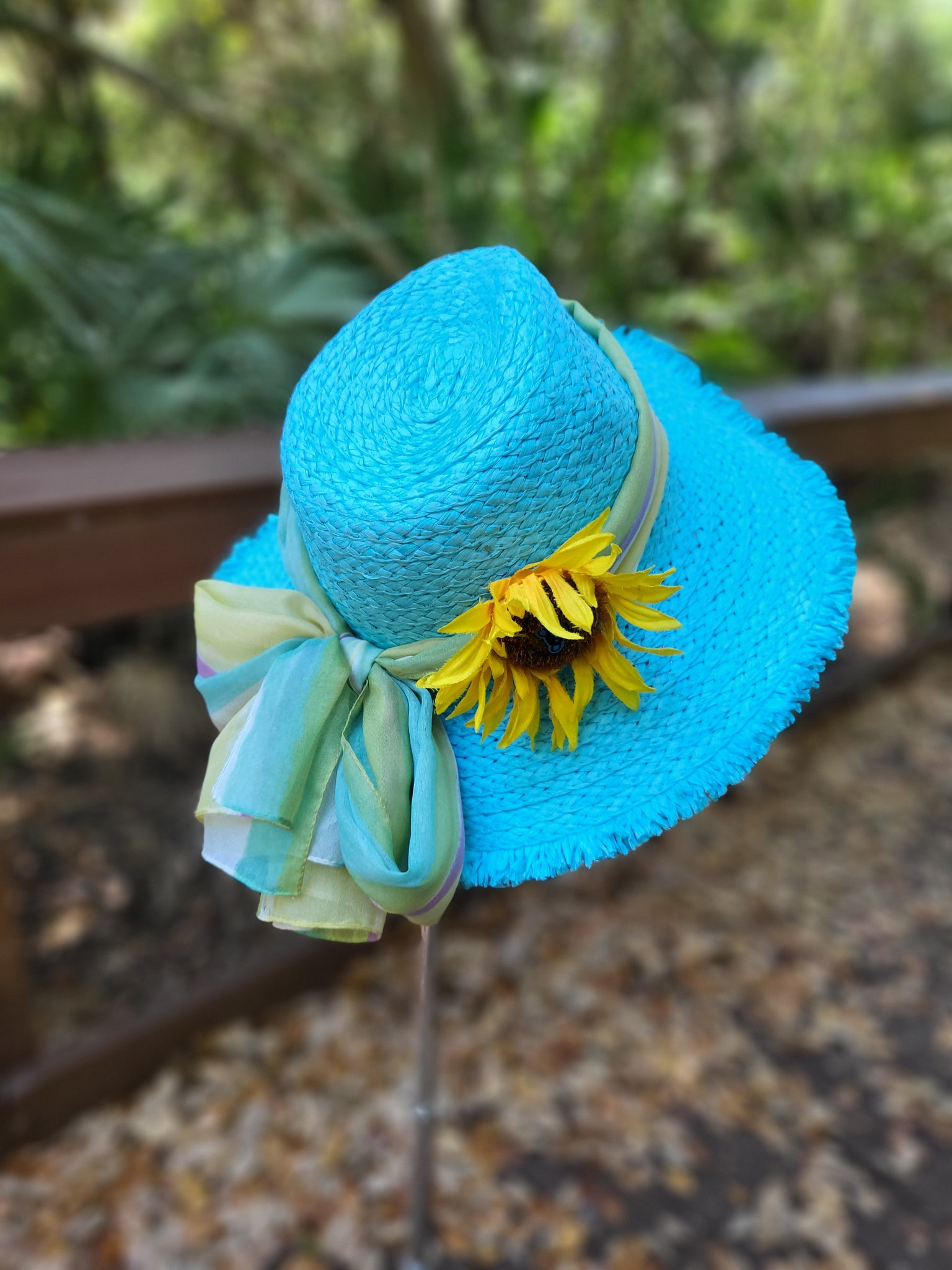 Adorned with a hand picked detachable vintage silk scarf and Sunflower Clip accompanied with a lil Owsely Bear Pin ! Scarf and Sunflower are both detachable so you can mix them up with any outfit of your choice! Pin subject to change from picture. Hat comes with a string inside to custom fit size to your head