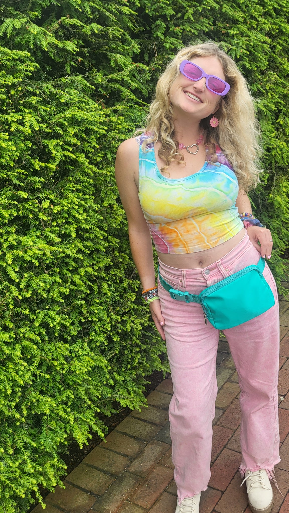 Cross body everywhere you go kind of bag. Water resistant fabric so you can wear rain or shine ! 4 pockets to keep your essentials safe organized and close to you . Adjustable strap to style at your leisure . Travel in style wear to your next show or festival! Can take this on the go bag with you anywhere, hiking, farmers market , thrift store , thus bag is made for the go getter kind of person  ! This will be your new favorite summer accessory!
