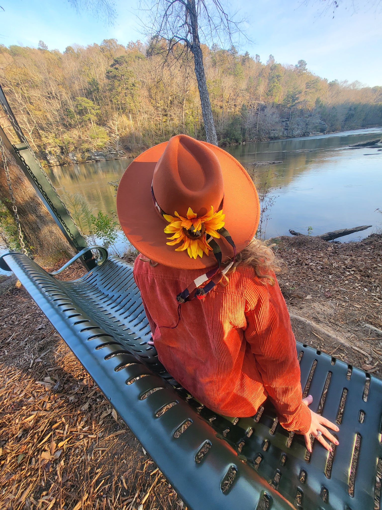 Gorgeous brown Wide Flat Brim Fedora with your choice of dudeband or scarf adorned on the hat with a detachable clip on Sunflower with your fav GD bolt pin!