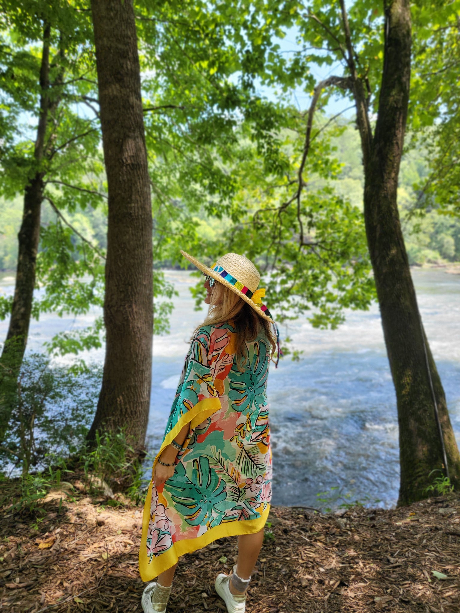 This yellow tropical beach kimono is a vibrant and elegant garment designed for relaxed, stylish wear. Made from silky fabric, it drapes gracefully over the body, offering a luxurious feel and a smooth texture. The bright yellow color, often adorned with tropical prints like palm leaves , captures the essence of a sunny beach paradise. This kimono is perfect for layering over swimwear or casual outfits, adding a touch of sophistication and a splash of color to your look.
